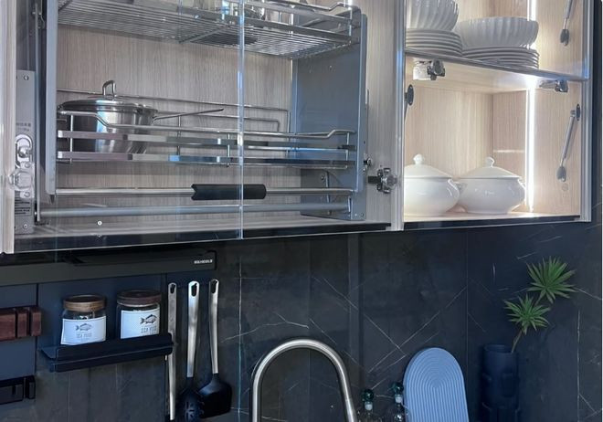 同时还要注意一点,就是地柜尽量多设计成抽屉式,而不是隔板式,而且可以预留专门的小厨电抽拉层板或者是锅具的深抽,打造出专属抽屉。
