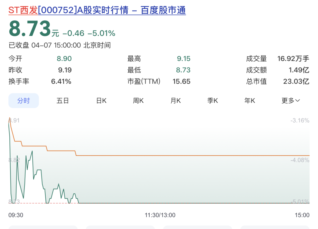 截至今日收盘,ST西发跌5.01%,报8.73元/股,最新市值23.03亿元。