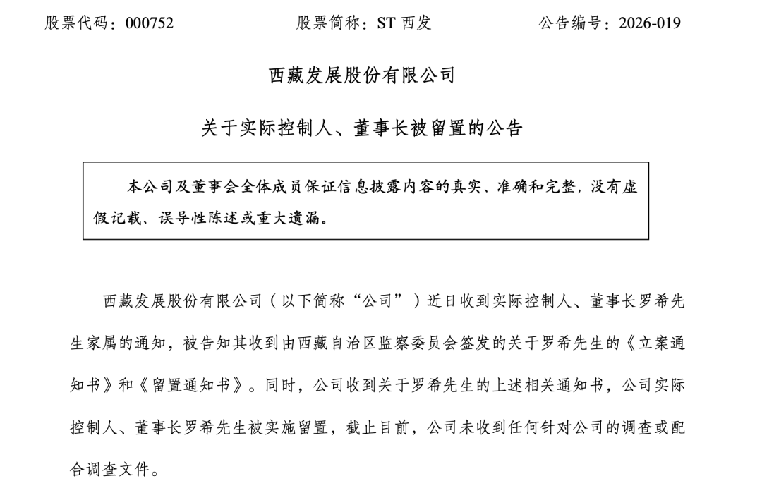 4月7日ST西发(000752.SZ)公告称,公司近日收到通知,实际控制人、董事长罗希被西藏自治区监察委员会实施留置。截至目前,公司未收到针对公司的调查文件。罗希已授权总经理陈婷婷代表其推进预重整及重大资产重组事项,并代为出席股东会行使表决权;副董事长廖川代为履行董事长职责。目前公司控制权未发生变化,其他董监高正常履职,日常经营正常,该事项暂未对董事会运作及公司经营产生重大影响。公司处于预重整阶段,重大资产重组工作正在进行中,但能否进入重整程序及重组能否通过尚存在不确定性。